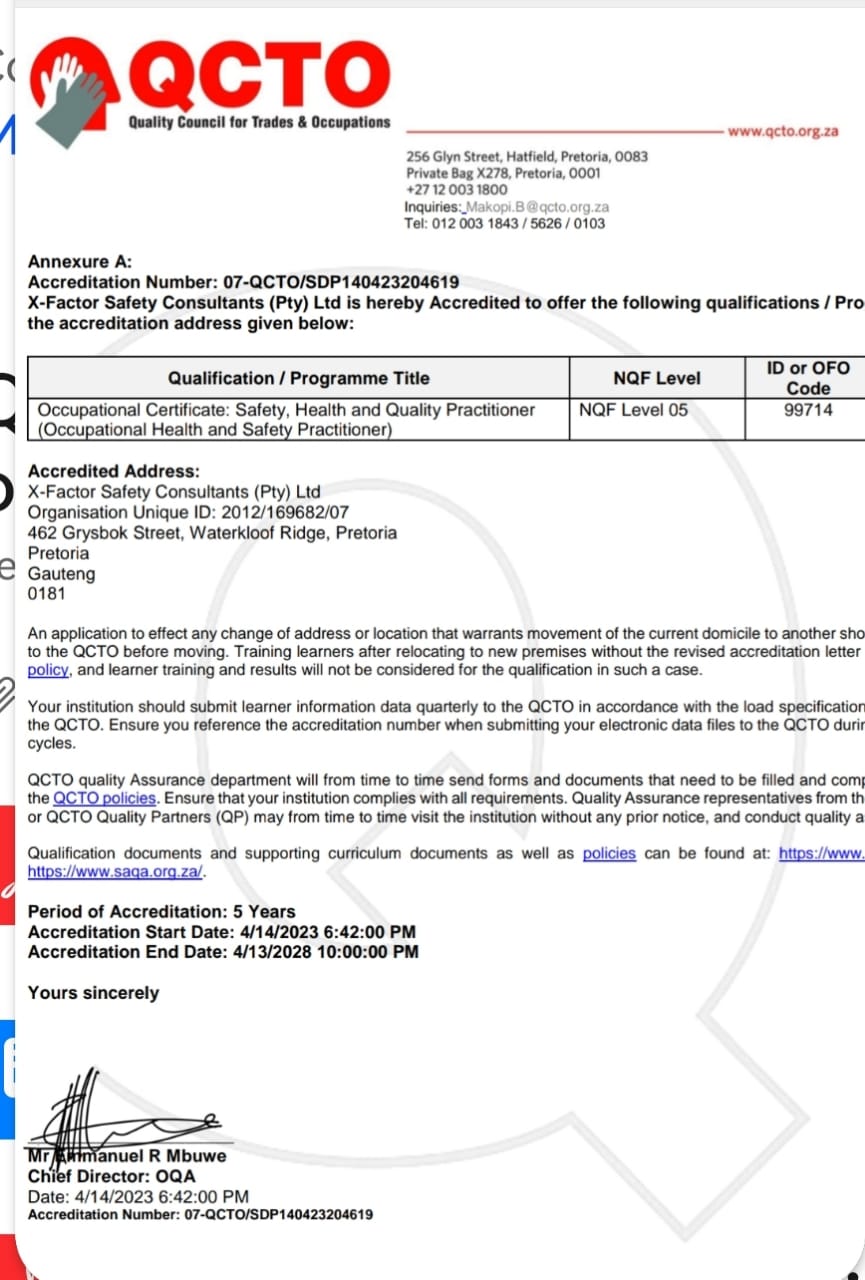 We are accredited with the following bodies: QTCO, CETA, SAQA and HWSETA. Accreditation letters available from Carine Kroukamp at email: carine@ohsas.co.za or phone 083 949 4308