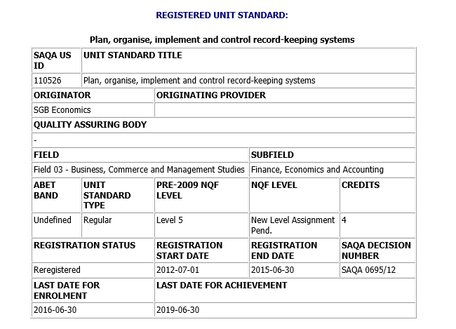 • Planning, organising, implementing and controlling record keeping systems according to the assessment criteria for specific outcomes: